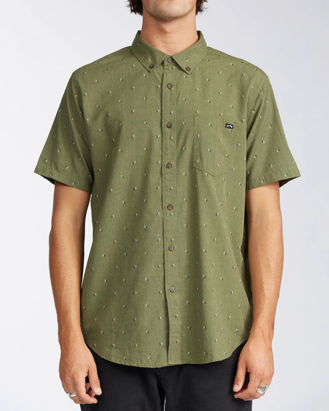 Style: M5073bsja staple with subtle custom design, the All Day Jacquard Short Sleeve Shirt brings a tonal pattern to your daily driver. Made to wear all day, every day the men’s button down finds a crisp look with a buttons at the collar points and a small woven label at the chest pocket. Features: : Mens’ short sleeve shirt. Button down. Chest pocket. Collar. Yarn dye jacquard pattern. Materials60% Cotton, 40% Polyester / Mens Woven All Day Jacquard in Military ( Mil) / Medium / Cotton/ Polyester / Billabong