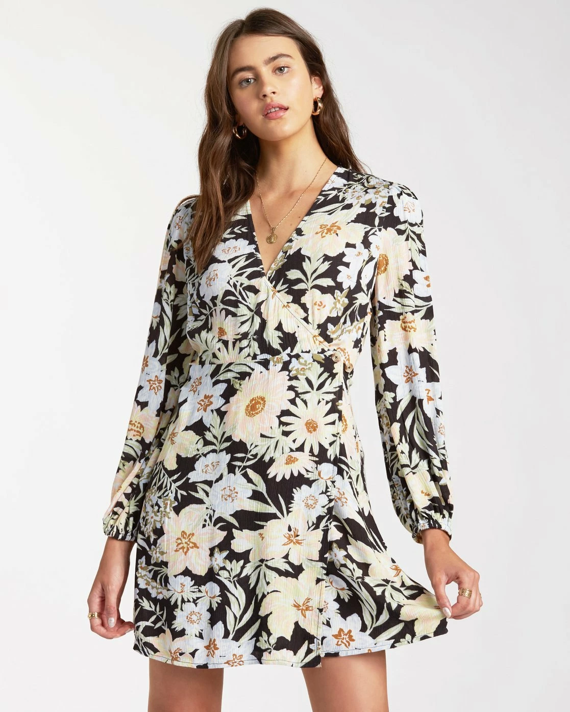 Wrapped in a custom floral print, the Billabong Lotta Love fully embraces the spirit of summer. Lightweight and easy thanks to a crinkle fabric, the women’s wrap dress delivers effortless style, adding a custom floral print and long, full sleeves with elastic bound cuffs. Features: : Women’s Wrap Dress. Fabric: Crinkle viscose fabric. Fit: Flared fit. Neck: V-neckline on front. Wrap closure with adjustable buttons on waist. Long sleeves with elastic at cuff. Pattern: mini floral print. Materials100% Viscose A B J W D00158 / Womens Dress Lotta Love in Black / Small / Billabong