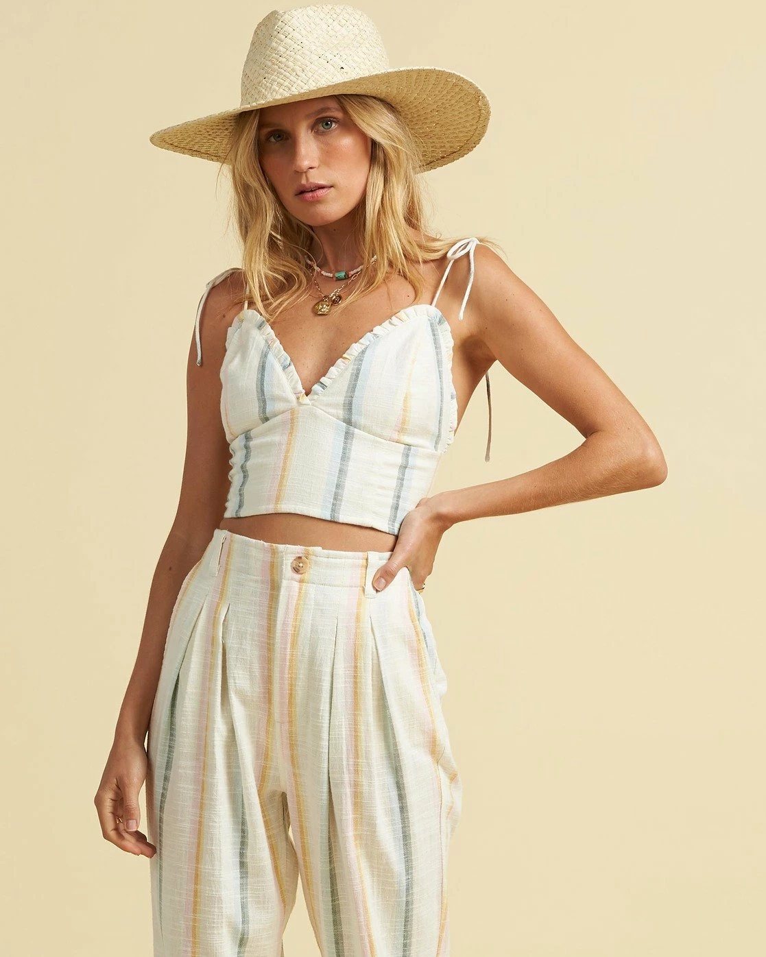 Style: J5253bnoa play on a triangle bikini top, the Billabong Northern Lights Crop Top doesn’t stray too far from its sun-bleached sister. Preserving your bikini top tan lines long after you’ve left the beach, the woven cami features tie-top spaghetti straps, triangle cups edged with feminine ruffles and a smocked back panel. Eco certified by the Better Cotton Initiative, the cotton construction ensures you’re doing good while looking good. Features: : Billabong x Salty Blonde Collection. Womens’ triangle crop top. Smocked back panel. Adjustable spaghetti straps. Pattern: yarn dyed stripes. Material: Eco- Conscious Cotton. Materials100% Cotton Model Details: Paige is wearing a size Small. Height: 5’9′ Chest: 32′ Waist: 23′ Hips: 34′ / Womens Tank Top Salty Blonde Northern Lights in Multi / M/10 / 100% Cotton / Billabong