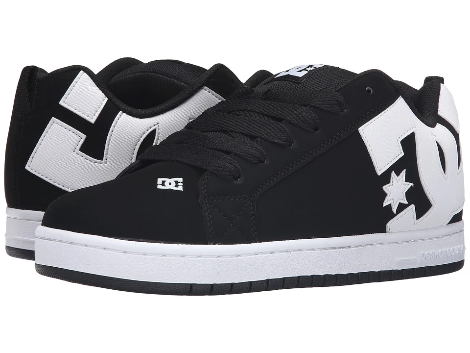 Soft and resilient action leather upper for abrasion resistance and durability. Foam-padded tongue and collar for added comfort and support. Soft tricot lining. Internal elastic tongue holders for added foot stability. Highly abrasion-resistant sticky rubber cup sole. Multi-tone bottom with DC’s trademarked “pill pattern. Sole design provides excellent ground contact, wear and flex.