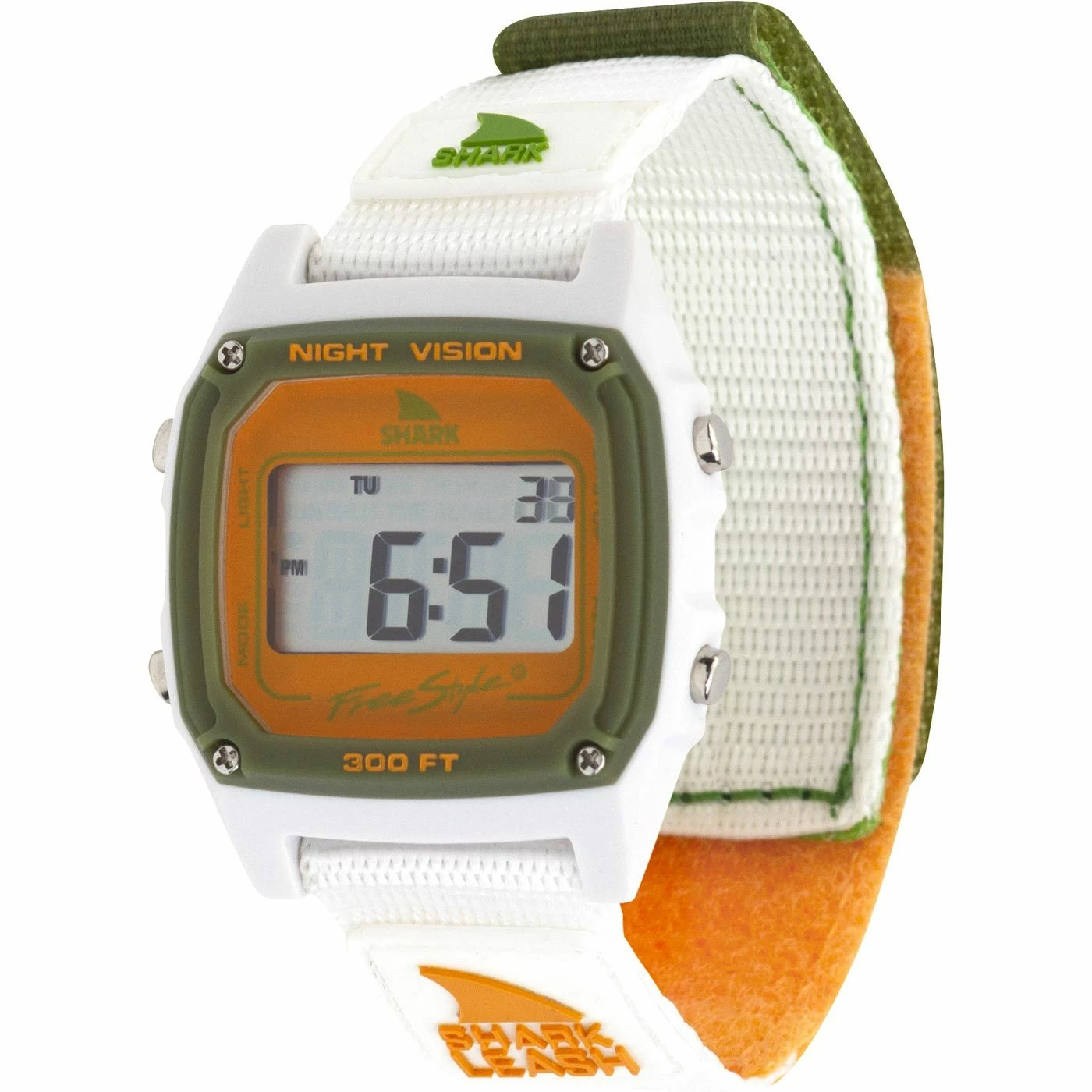 The original Velcro band that ignited Freestyle Watches in the late 80’s is back and better than ever. The shark leash’s velcro closure system is modeled after an 80’s style surfboard leash, and is ready to get radical. The Shark Leash comes loaded with standard digital features like time, date, stopwatch, countdown timer, alarm and night vision backlight. Like all Freestyle Watches, The Shark Leash is water resistant to 100 Meters and backed by our limited lifetime warranty. Shark to the Future! Style#: Fs101062 / Watch Shark Leash Happy Camper in Multi / Freestyle