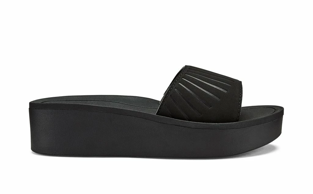 The beautiful movements of hula are complemented by the hand-made attire and flowers the dancers wear. Olukai complement the Halu’a’s beautiful wedge with grass-skirt and lehua flower Detail s. F E A T U R E S Elastic gore webbing for personalized fit, embossed strap art design inspired by a hula grass skirt radiating outward. U P P E R Water-resistant synthetic slide strap with quick-drying jersey knit lining and gore elastic for personalized fit. F O O T B E D Anatomical, poured light-weight Pu wedge topped with a soft, molded Eva foam footbed ensuring a plush ride for all-day instep comfort. O U T S O L E Non-marking rubber outsole, design inspired by the lehua flower. / Womens Sandals Halu’a in Black / 5 / Olukai