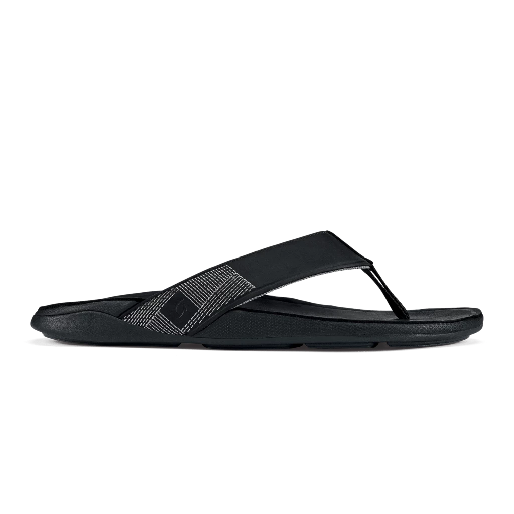 The Tuahine is the ideal all-day leather sandal. Crafted with waterproof, full-grain leather and stitching inspired by the winds of Hawai’i, this style is a breeze to wear no matter the occasion. Premium, waterproof, full-grain leather with a soft stretch mesh lining and a comfortable nylon toe post create an ultra-comfy fit. Anatomical, compression-molded Eva midsole with a premium full-grain leather cover delivers all-day support and cushioning. Non-marking ‘ Wet Grip Rubber’ outsole with breeze block lug design for added traction. / Mens Sandals Tuahine in Black / 10 / Nylon / Olukai