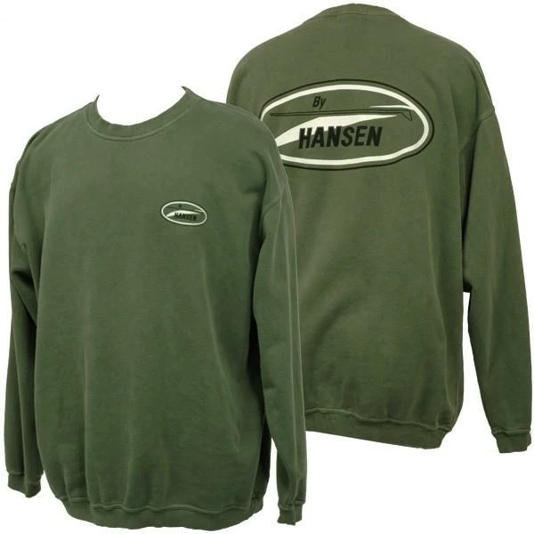 The Original logo crew neck sweatshirt is a regular fit pullover sweatshirt with a screen print design of our original logo on the front and back. Pacific and Olive colorways are made of 100% cotton. Navy Heather is made of a cotton/poly blend. / Mens Sweatshirt Original Logo Crew in Olive / 2 X- Large / 100% Cotton / Hansen