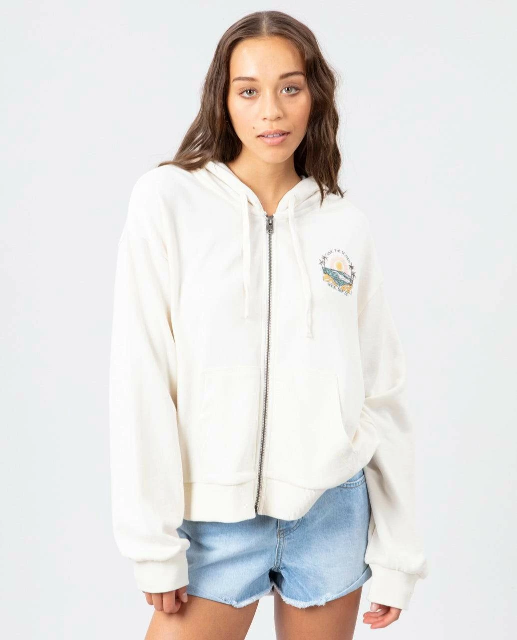 The Coastal Search Zip Fleece is the perfect, cozy hoodie. This hoodie was designed to have a standard fit and full zip, with an added back graphic. Standard zip up fit Cozy fleece Chest screen Back screen C O T T O N/ P O L Y Plush F L E E C E Model Wears Model is 176 cm (5’8) and wearing a size X S. Style Code Gfedo7 / Womens Sweatshirt Coastal Search Zip Fleece in Bone ( Bon/3021) / X- Small / Cotton / Rip Curl