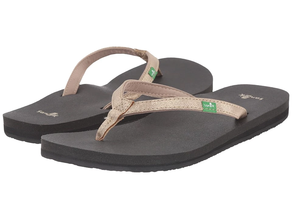 Find your happy place with the Yoga Joy Metallic flip-flops from Sanuk. Metallic synthetic strap with soft jersey lining. Metallic synthetic covered nylon webbing toe post for comfort. Thin profile. Footbed made from real yoga mat provides all day comfort. Added arch cookie for support. Sponge rubber outsole with repeating Happy U logo tread. Vegan and vegetarian friendly. Sanuk logo on strap and footbed. Imported. Measurements: ; Heel Height: 3 4 in ; Weight: 4 oz ; Product measurements were taken using size 9, width B – Medium. Please note that measurements may vary by size.