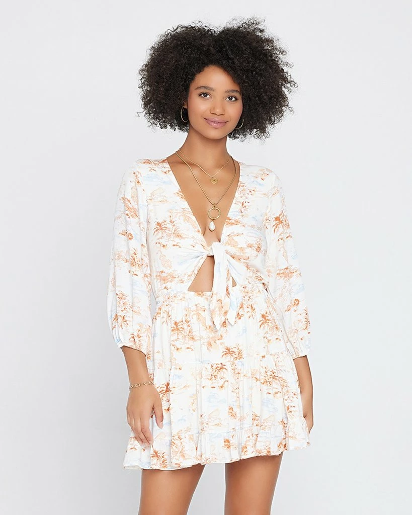 The Stay Golden Dress is a little bit of romance and a whole lot of comfort. This skater dress features a comfy elastic waist, breezy sleeves, and peasant-inspired tiered skirt. Includes a functional tie front and keyhole cutout. Printed skater dress 3/4 elastic sleeves Functional V Tie front with key hole Detail Elastic waist Tearing on skirt100% rayon / Womens Dress Stay Golden in Tropical Sands ( Tos) / X- Small / L* Space