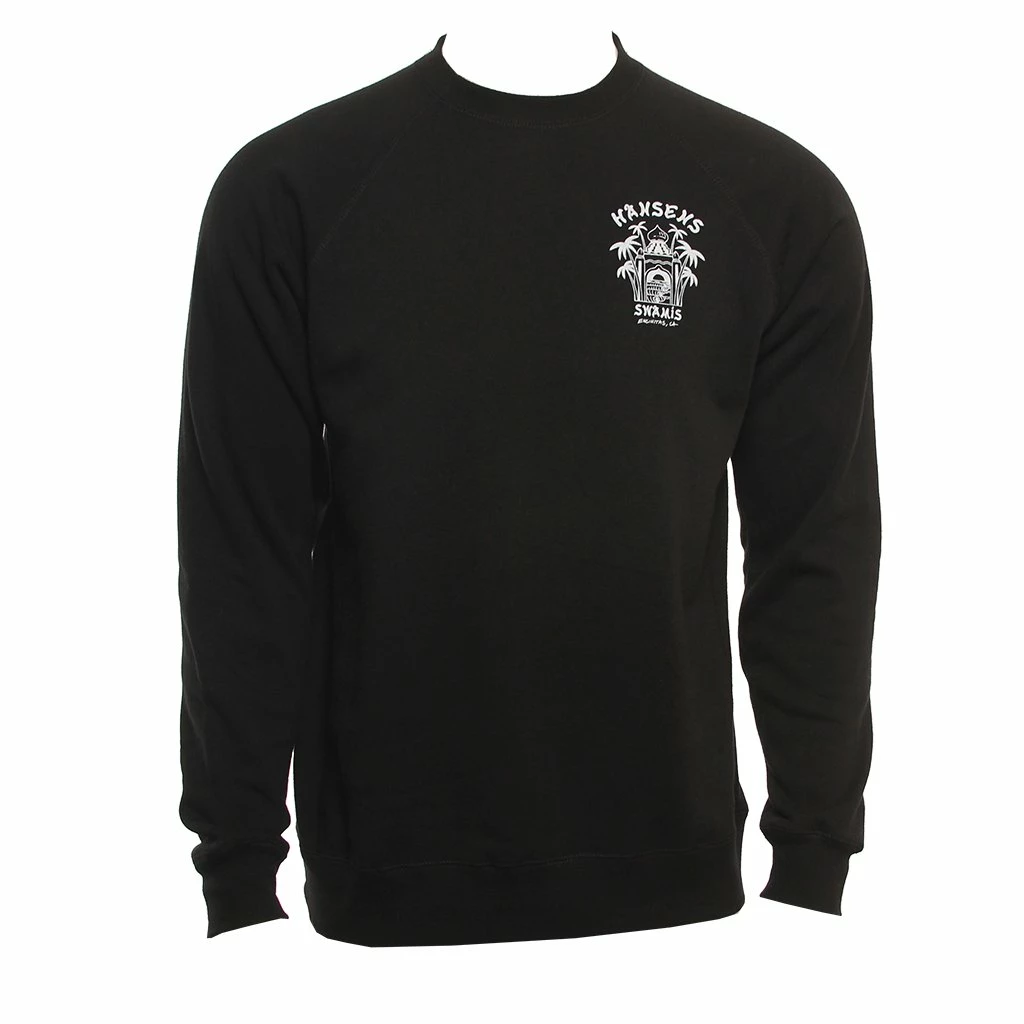 Mens crew neck sweatshirt Swamis screenprinted graphic, large on back, small on left chest, palm print on right sleeve52% cotton / 48% polyester / Mens Sweatshirt Surf Temple in Black / Medium / Cotton/ Polyester / Hansen