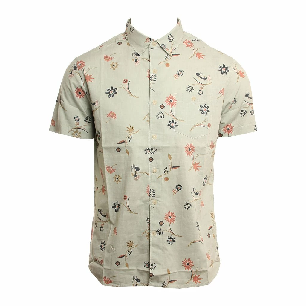 Printed light weight Ss woven. Fold over center front placket button down front chest pocket and contrast chambray lining at inside back yoke. Garment washed with softener + enzyme.100% cotton / Mens Woven Bunga Bunga in Agave / Large / 100% Cotton / Vissla