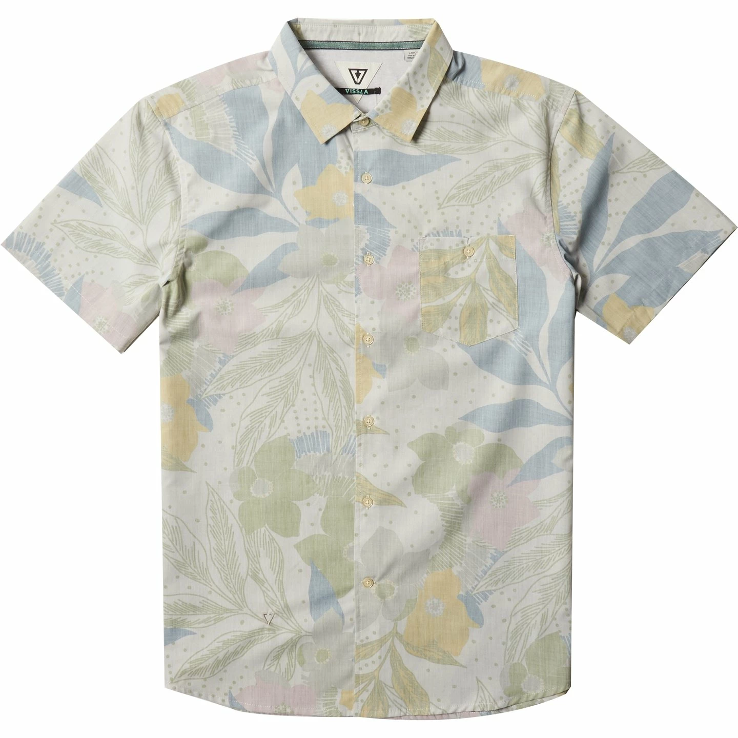 Recycled poly Repreve/cotton floral reverse printed light weight Ss woven. Fold over center front placket button down front chest pocket and contrast chambray lining at inside back yoke. Garment washed with softener + enzyme.80% Recycled Polyester 20% Cotton / Mens Woven Mo Bettah Eco in Bone ( Bon) / Small / Cotton/ Polyester / Vissla