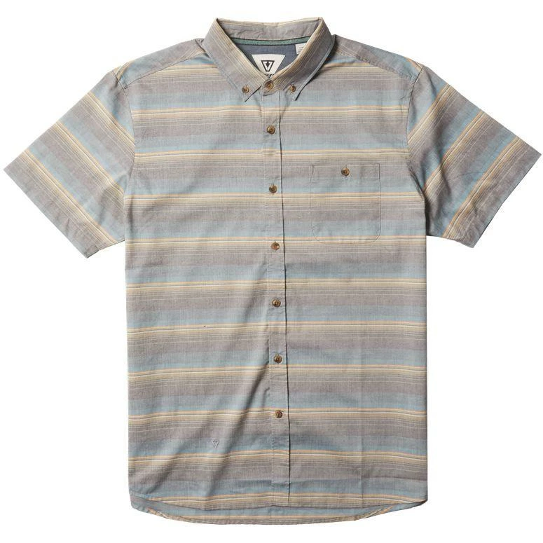 Cotton/recycled poly yarn dyed stripe light weight Ss woven. Sewn in center front placket button down front chest pocket and contrast chambray lining at inside back yoke. Garment washed with softener.55% Cotton 45% Recycled Polyester / Mens Woven Santanas Eco in Java ( Jav) / Small / Cotton/ Polyester / Vissla