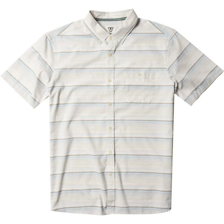 Cotton/recycled poly yarn dyed stripe light weight Ss woven. Sewn in center front placket button down front chest pocket and contrast chambray lining at inside back yoke. Garment washed with softener.55% Cotton 45% Recycled Polyester / Mens Woven Santanas Eco in White / Small / Cotton/ Polyester / Vissla