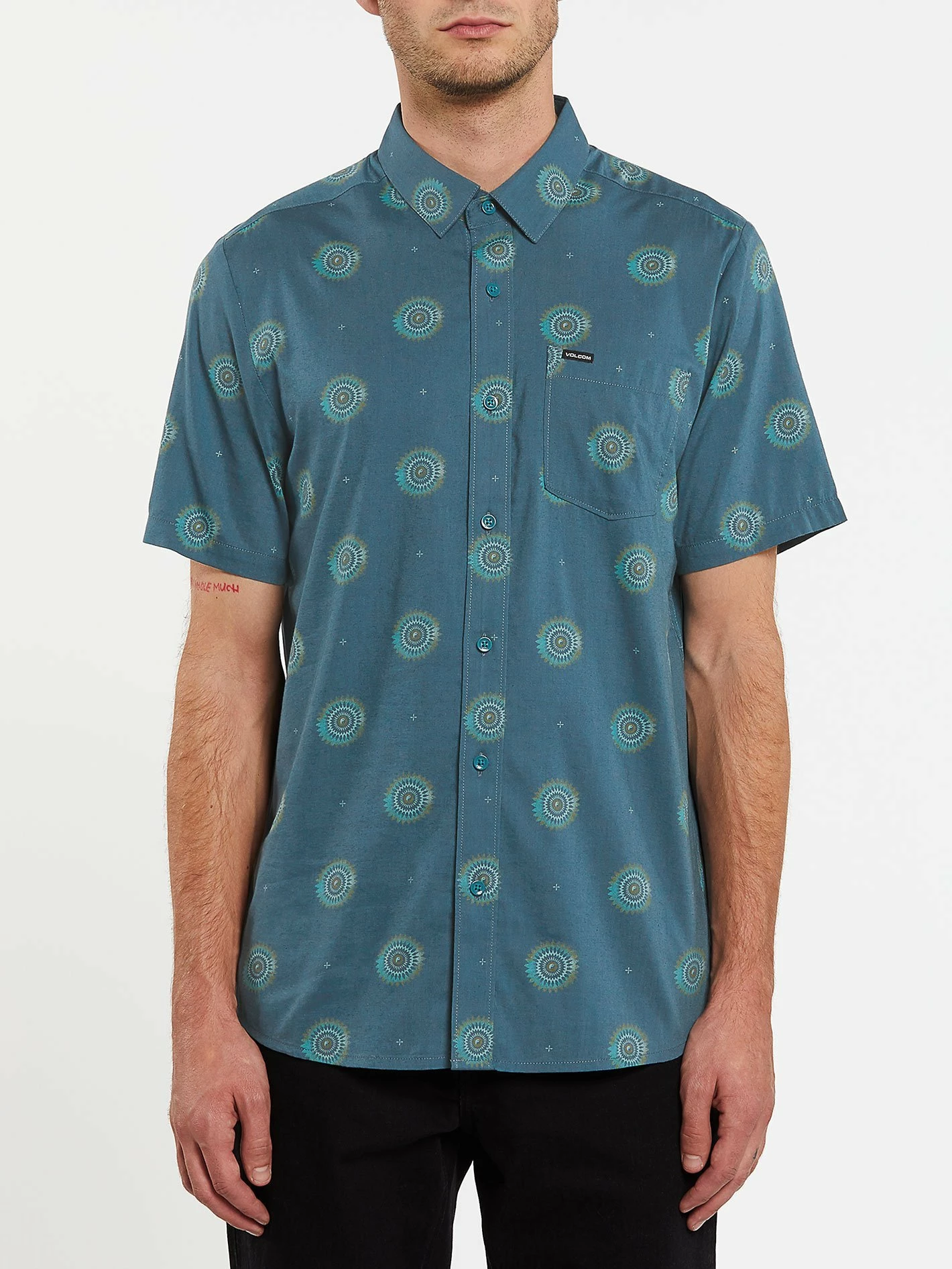 55% Cotton / 45% Polyester W/ All Over Wet Print Modern fit Woven label Custom logo buttons / Mens Woven Inner Valley in Blue / Large / Cotton/ Polyester / Volcom