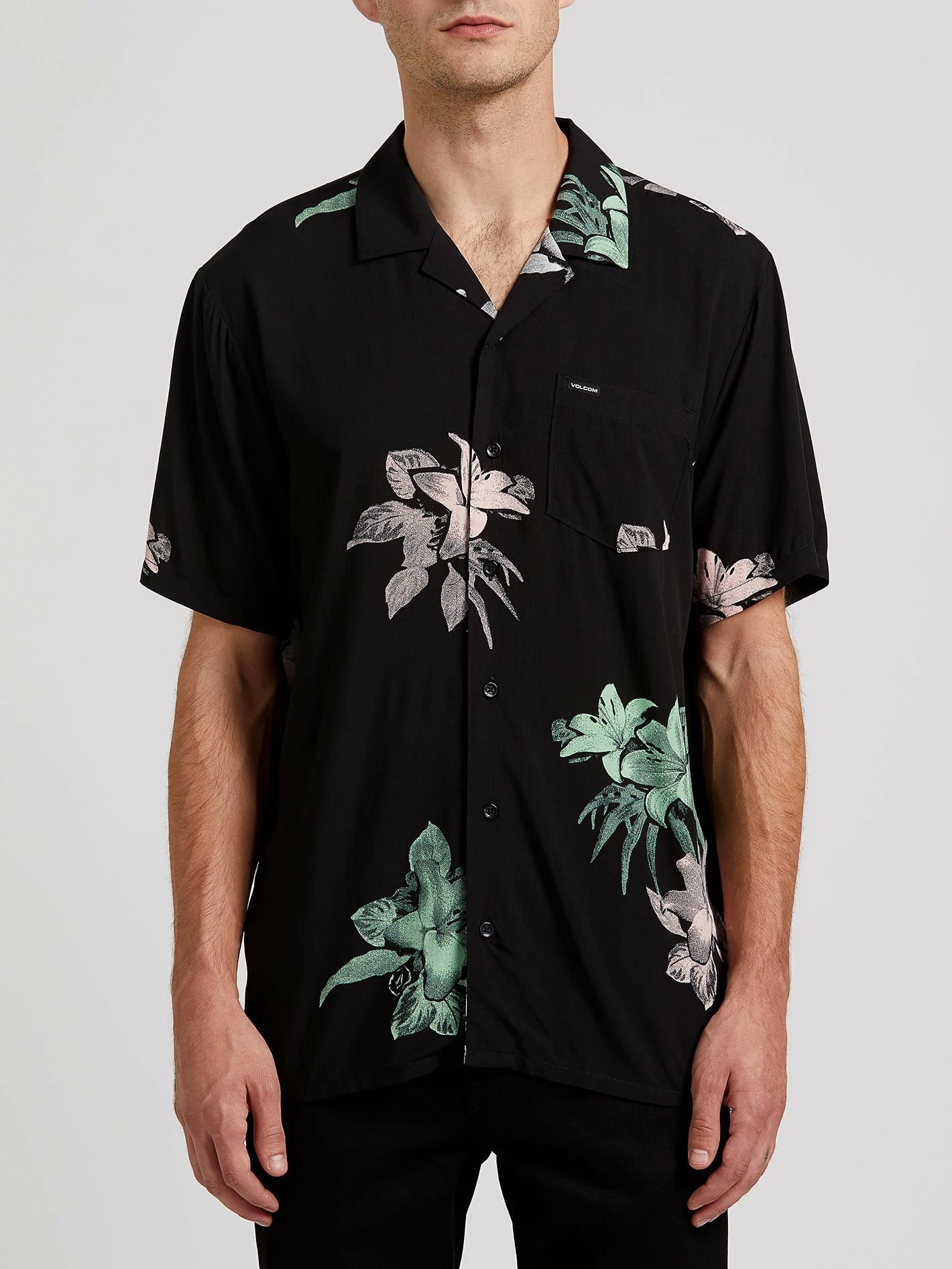 Fluid matte viscose keeps it cool in the Richardt short sleeve shirt. The party-essential gets a smooth remake with all-over sparing florals etched in lithograph pastels. Classic fit Woven label Custom logo buttons / Mens Woven Richardt in Black / Large / Volcom