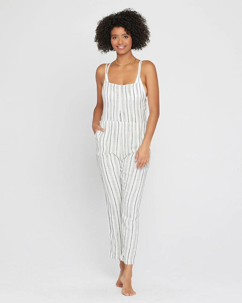 Add some vacay vibes to your everyday style with the Sadie Jumper. Crafted from breezy fabric, this full-length jumpsuit features a flattering, slim straight leg, adjustable tie straps, front pockets, and a hidden zipper. Perfect for warmer days or as a stylish beach cover-up. Full length jumper Pockets Tie straps Invisible zipper Slim straight leg85% viscose, 15% cotton Style# Sadju21 / Womens Jumper Sadie in Summer Nights Stripe ( Snt) / Medium / Cotton / L* Space