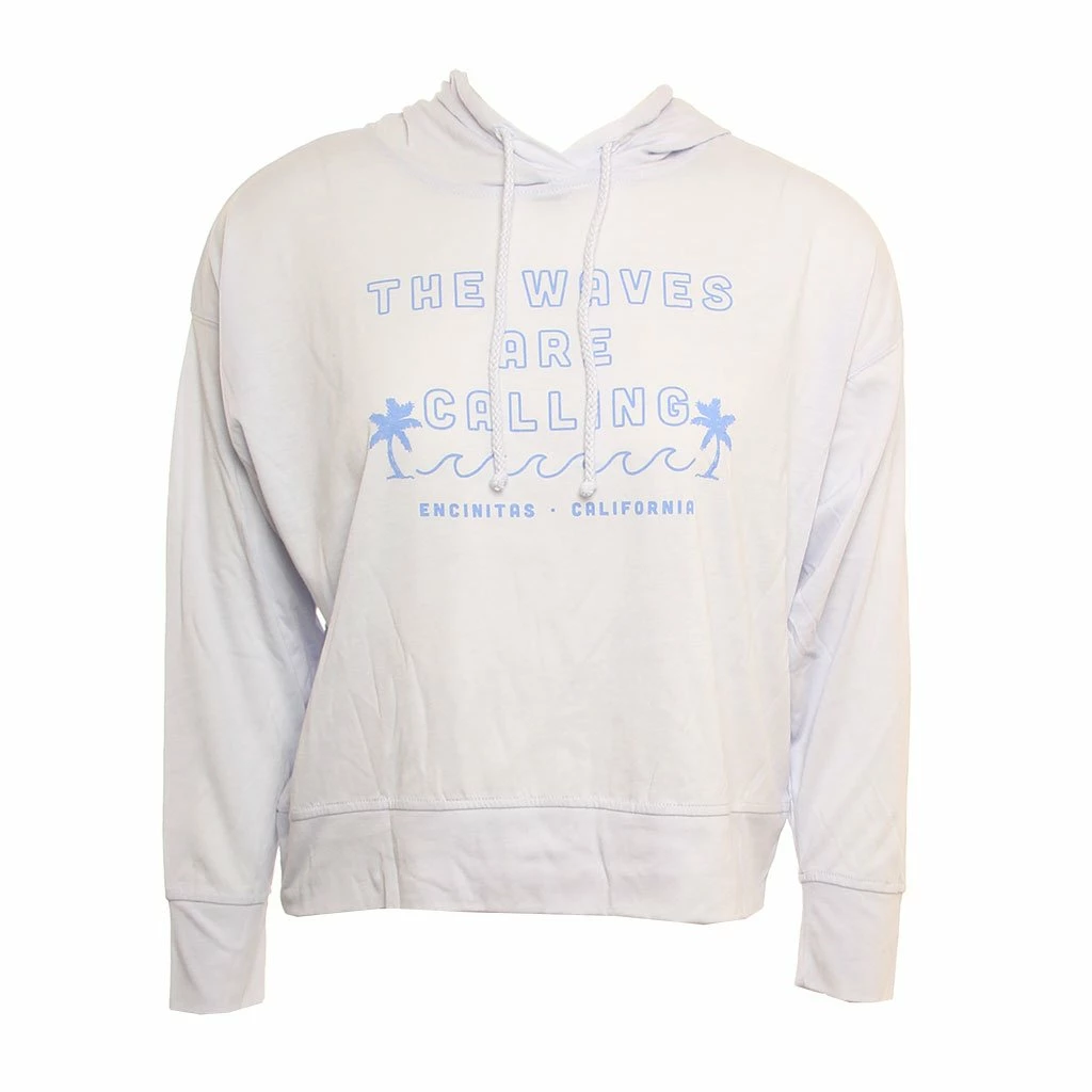 The Hansen Womens Shirt Yoohoo Le Marias is a 52% Cotton 48% Polyester blend long sleeve hooded shirt with front screen print / Womens Shirt Yoohoo Le Marias in Ice / Large / Cotton/ Polyester / Hansen